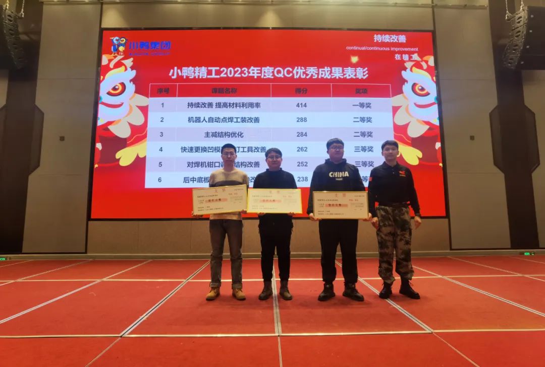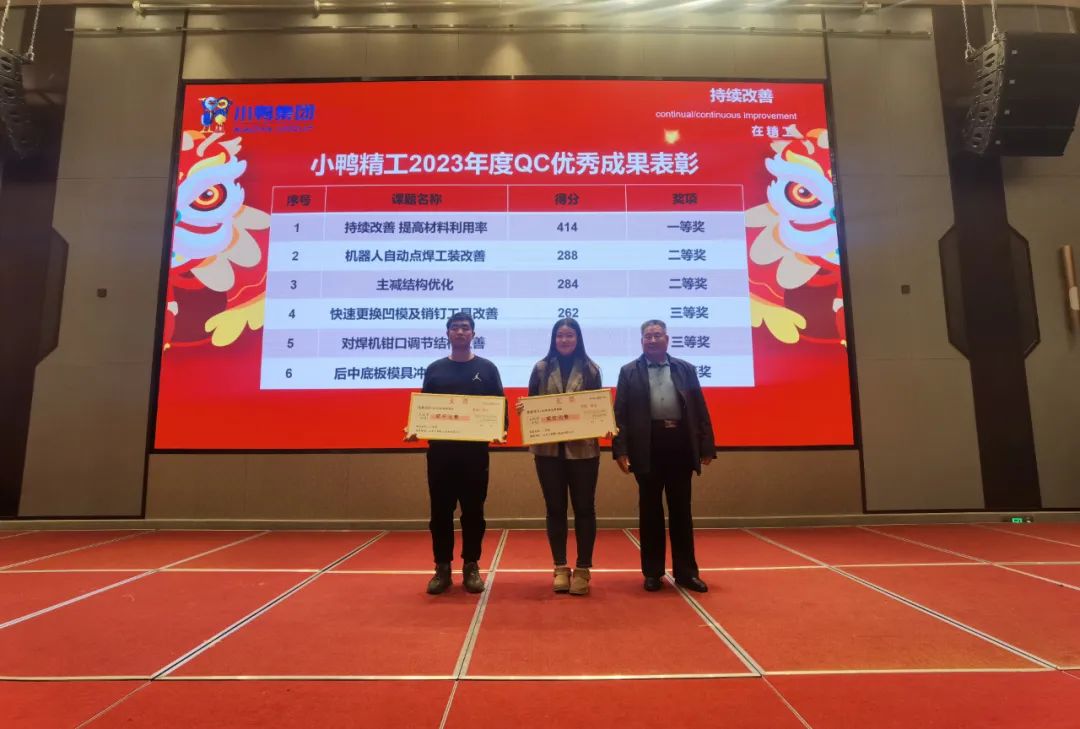 降本增效,提高質量,持續改進。12月30日,小鴨精工2023年度QC優秀成果發表會在萊蕪舉辦。經過一年的精選和籌備,共有6個項目在本次會議上發布,成果涵蓋汽車零部件產品、車橋產品、車輪裝備產品、模具產品、機器人應用等。