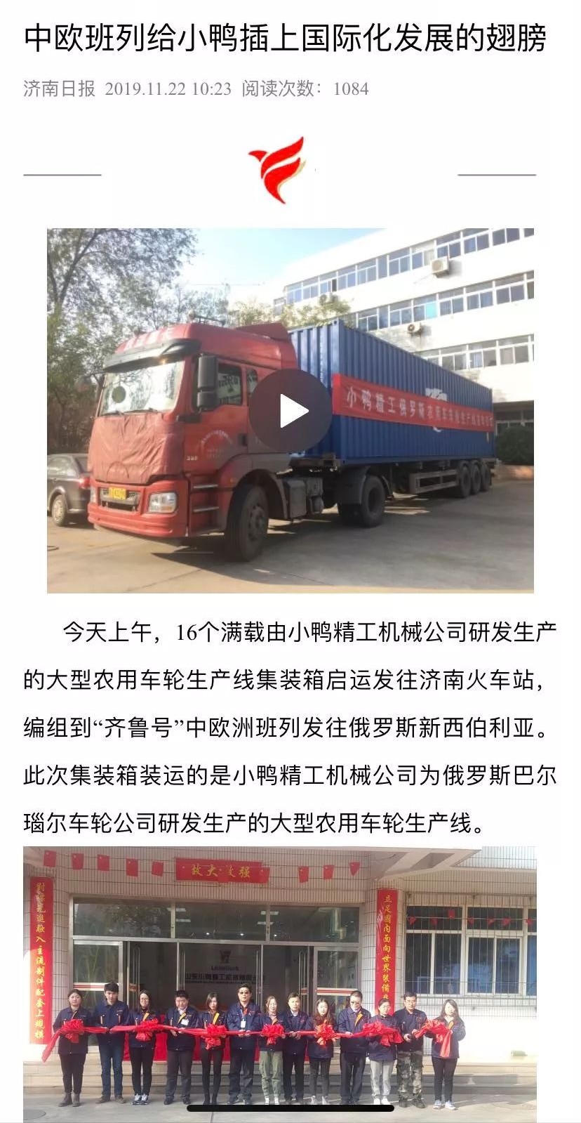 11月22日,小鴨精工俄羅斯農(nóng)用車車輪生產(chǎn)線發(fā)車儀式正式啟動,16個(gè)集裝箱將陸續(xù)發(fā)到濟(jì)南火車站,編組到"齊魯號"中歐班列發(fā)往俄羅斯新西伯利亞。