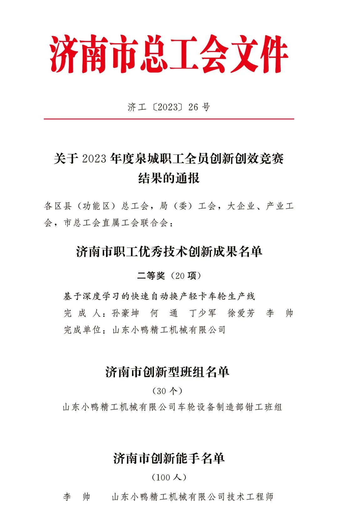 11月29日,濟南市總工會開展的2023年度泉城職工全員創新創效競賽中,小鴨精工基于深度學習的快速自動換產輕卡車輪生產線獲得“濟南市職工優秀技術創新成果”二等獎、小鴨精工車輪設備制造部鉗工班組評為“濟南市創新性班組”稱號、小鴨精工技術工程師李帥被評為“濟南市創新能手”。